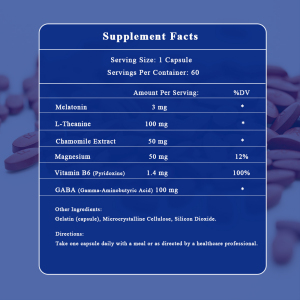 This Melatonin nutritional supplement is designed to support restful sleep, promote relaxation, and improve sleep quality. Melatonin helps regulate the sleep-wake cycle, making it easier to fall asleep and stay asleep. L-Theanine, Chamomile Extract, and GABA are included to enhance relaxation and reduce stress. Magnesium and Vitamin B6 support metabolic functions and overall well-being.