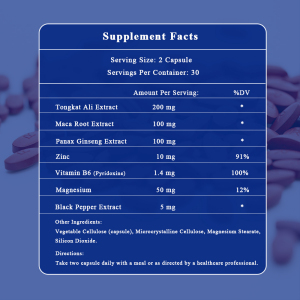 This Tongkat Ali nutritional supplement is designed to support male vitality, enhance energy levels, and promote overall well-being. Tongkat Ali is known for its potential to boost testosterone levels and improve sexual health. The addition of Maca Root and Panax Ginseng further enhances stamina and endurance. Zinc and Vitamin B6 support metabolic function and immune health, while Black Pepper Extract improves absorption of the active ingredients.